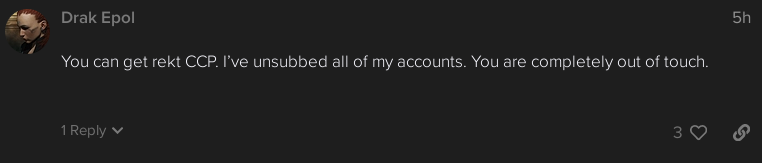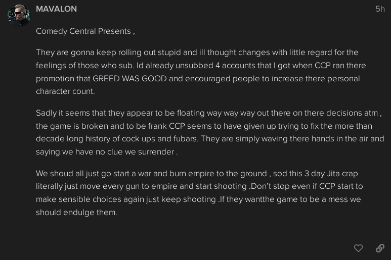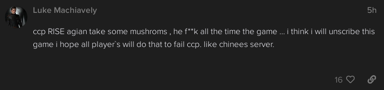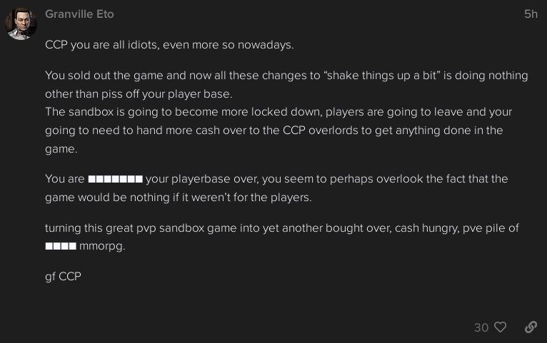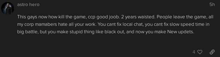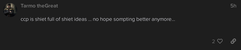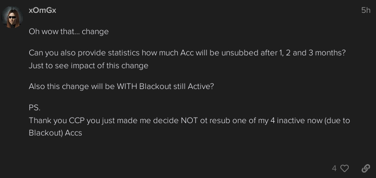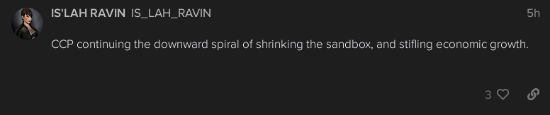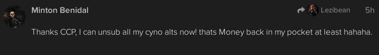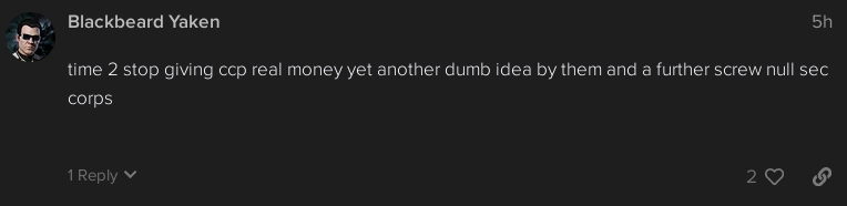 You didn’t see the essence. That’s a stupid idea. What the ccp wants is to extend its account for 70 days to make a profit. There are too many game bills? Do you know why? Ccp drives this extreme without game currency because its currency, flex, is sold in cash. This game is falling apart. For your little gang. LOL