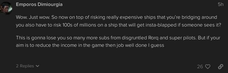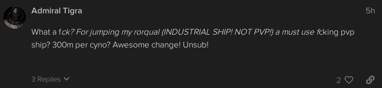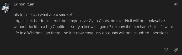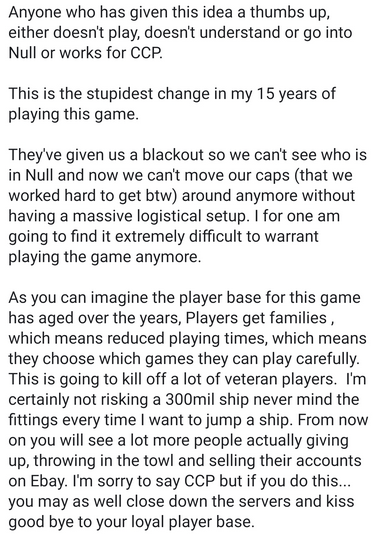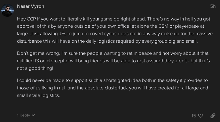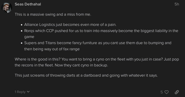 This is an amazing step-back to make the use of capitals interesting AND challanging again. Oh, you can’t jump your Rorqual? Ask your corpmates for a cyno. Don’t do everything with your own alts.
