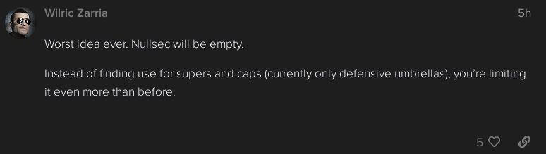 Given that, from experience, the standard nullsec response to a single roaming ship is measured in total supers, titans, and FAXes, I somehow don’t think that this cost is an issue. Maybe you shouldn’t be able to prevent gameplay with one button because you can’t be arsed to even try and fight back against a 5-man gang.