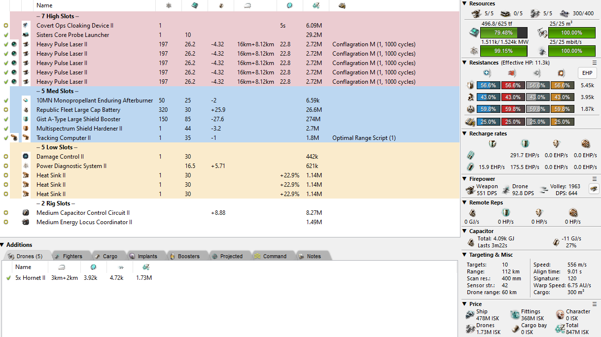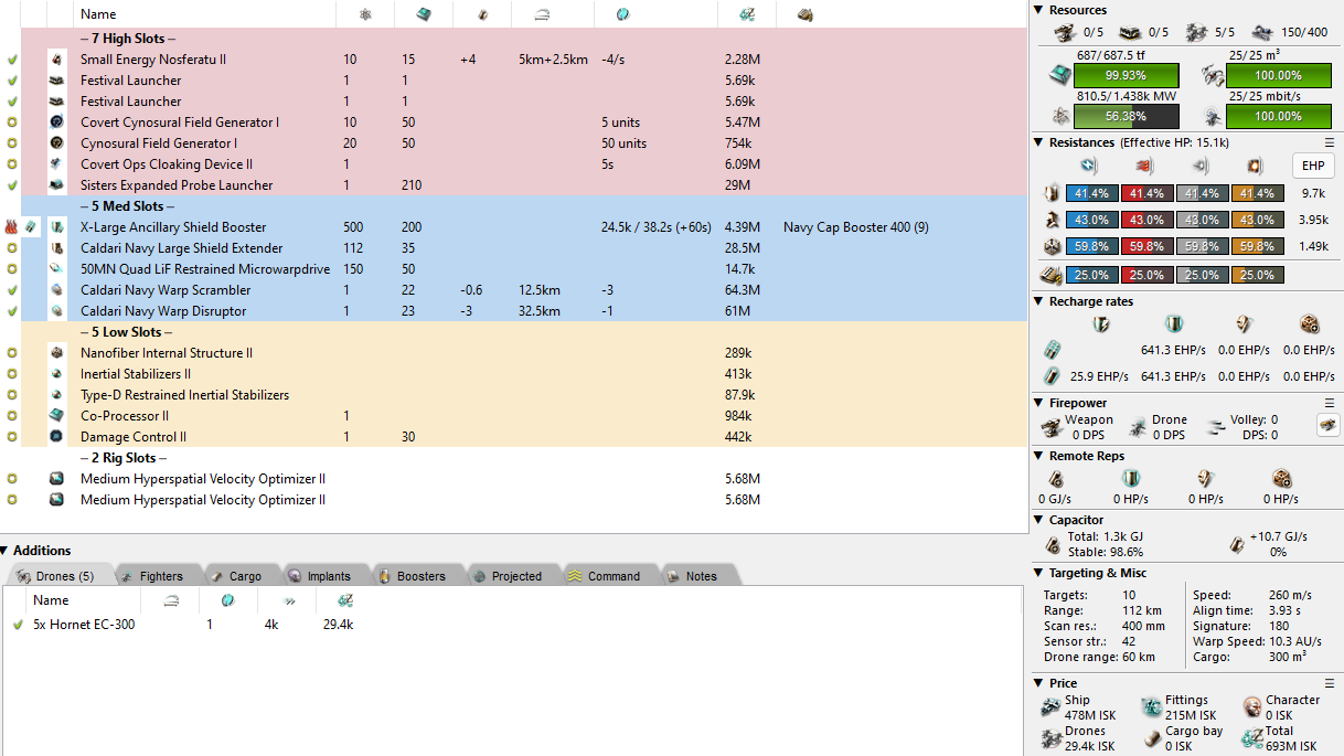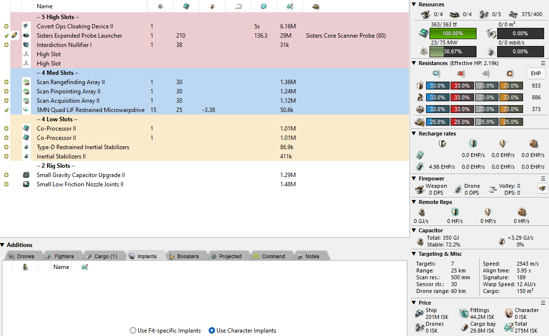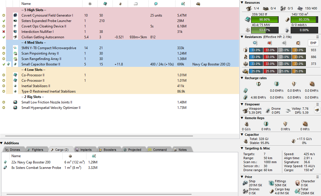 Another way to use your scanner would be to leverage that amazing warp speed to produce a nullified ship that can land covert cynos in a system faster than anything else in EVE while still preserving the ability combat scan. This idea came about when talking to a friend who wanted to do exactly that but was running into CPU issues. The way it works is that by having a cap booster fitted to a mid slot you can easily online and offline modules without a mobile depot. This allows you to reach your location with a nullifier fitted. You’ve then got the capacitor to instantly online a cyno, bring in the fleet, and then restart your nullifier. It’s a weird edge case, but I love the cap booster online/offline idea.