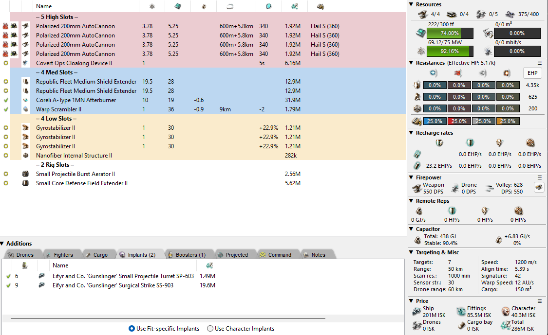 And finally, we can move onto those guns. As it turns out, a polarised blaster Pacifier can do somewhere in the region of 701 DPS with 3% implants and a Pyrolancea Dose II. That’s honestly incredible and it makes me want to see a mini fleet of these frigates dropping 3,500 DPS on people. They’re like mini cloaked Hecates! There is a catch, though. With a range of 1+1km you won’t be hitting much, let alone moving around the target. Instead, I propose autocannons over blasters to give you that 5-6km falloff and about 550 DPS instead. This also frees up a low slot for a nano to let you further reduce incoming damage. Overall it looks really interesting and I would love them in action.