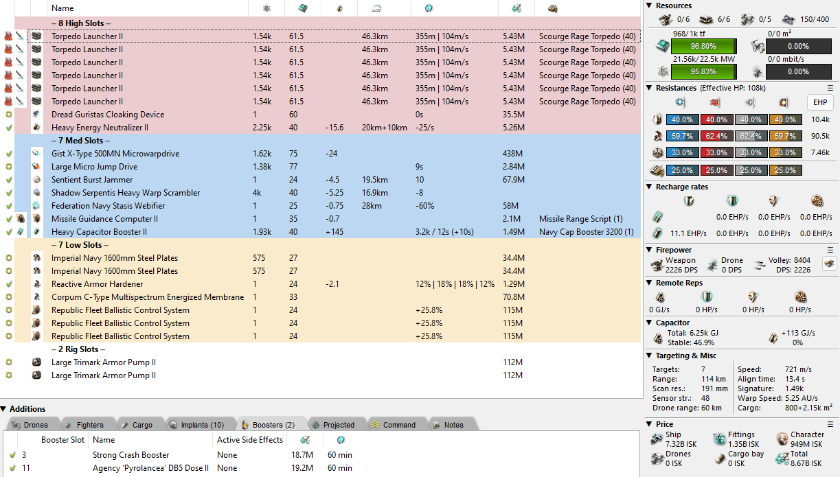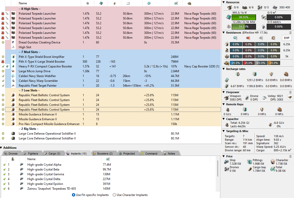 Now, due to the way that we fly the Marshal, we need to design the fit accordingly. In a usual blops drop you can get away with the usual double plate style as long as you focus on ensuring that you have two things: the DPS to get it over with fast, and the escape tools to leave (Burst Jammer, MJD, MWD, maybe even AB). The standard fit below has these with a focus on high damage. With cheap-ish implants, it will do north of 2,200 DPS from 46km with torpedoes. Just keep in mind that this is not a solo fit! There are arguments to be made that you should bling this as much as possible but honestly I don’t see the point. You aren’t going to be shot anyway if you do it right.
