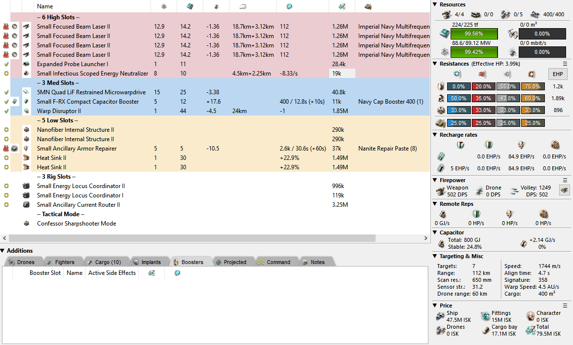 Next up we have a slight twist on the typical double nano fit that I keep seeing people use. I don’t like this at all, but it’s about as good as a solo kiting Confessor gets and you can use it in a no-logi nanogang if you like. The change I’ve made is to add on a defensive neut as a last chance GTFO button just in case you can sig tank until you cap them out! My advice would be to always be very aware of your own speed and make good use of that T3D heat bonus as much as you can if you are caught out of position when kiting. And know that anything even remotely anti tackle will melt you instantly. Just fly a Retribution instead…