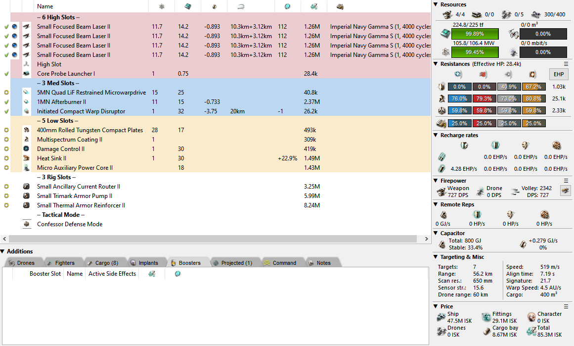 Let’s begin with the obvious fits again, shall we? For starters, we have my take on a Wolf Rayet wormhole fit. Long-range, good DPS, good buffer tank, and designed to fly with logi. It works outside of Wolf Rayets, too! If you didn’t know, a Wolf Rayet wormhole offers massive bonuses to armour buffer, small weapon damage, and signature radius reduction. This particular fit is designed to be dual prop, retaining the sig tank while also offering much-needed mobility that an AB plated Confessor just does not have. Just make sure that you utilise that mobility. Burn away from brawlers/ramping Kikimoras and get in close against bigger targets then hit the AB.