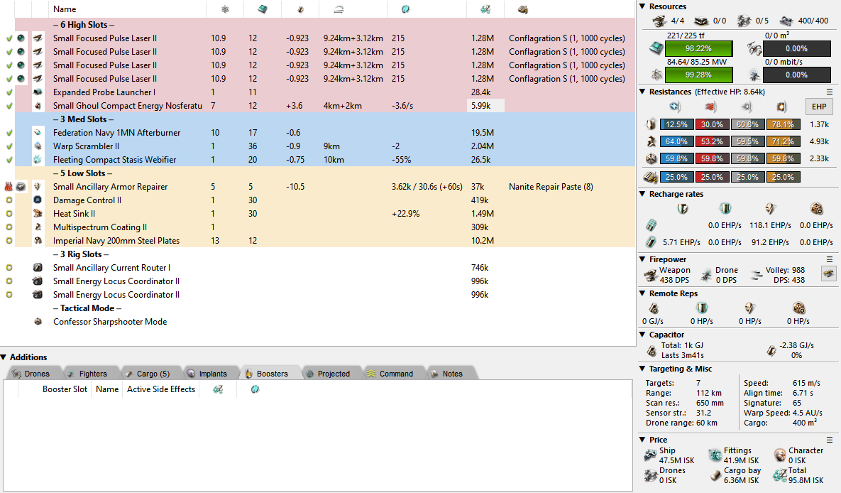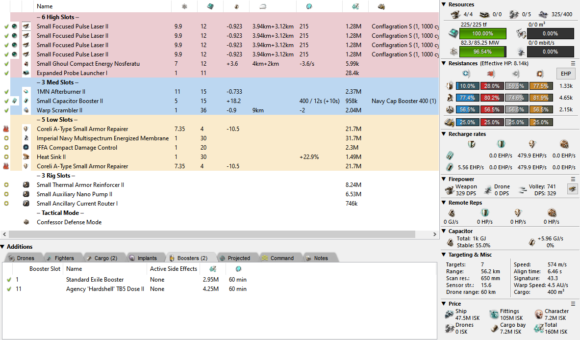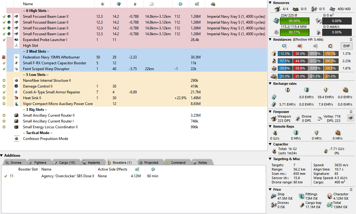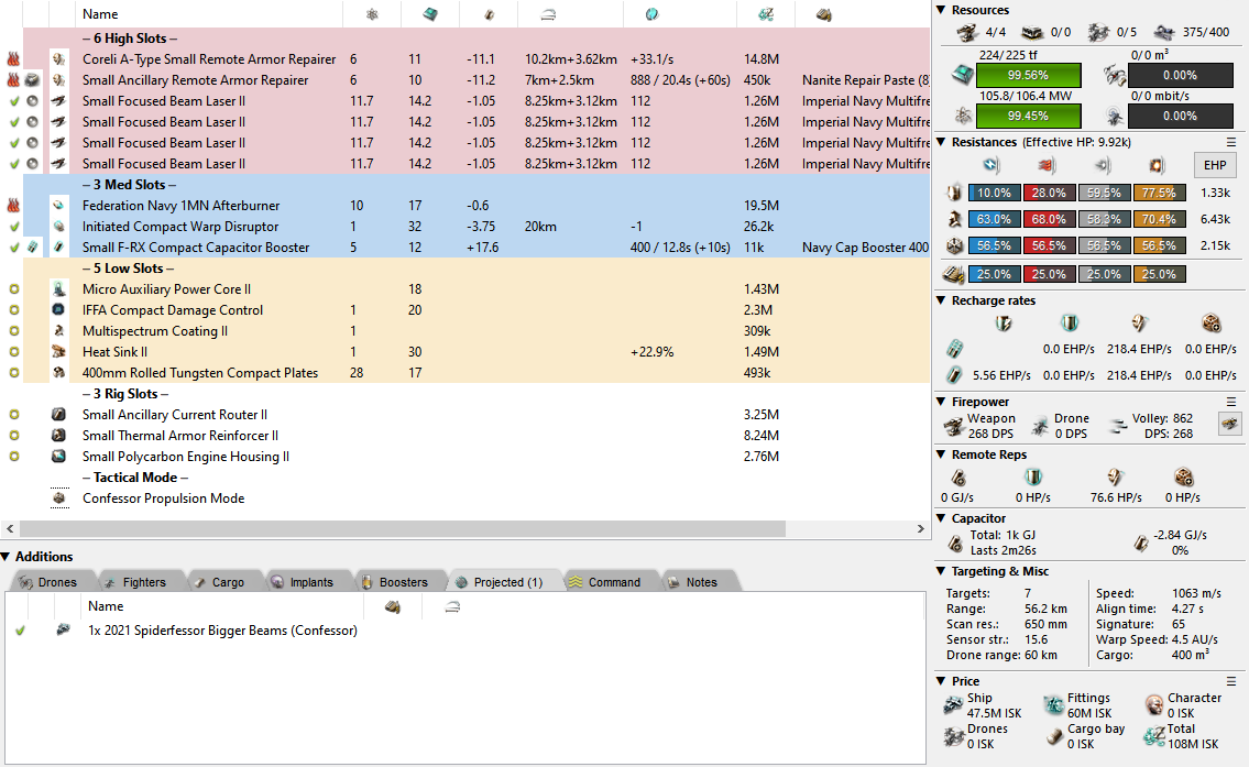And finally, we have a proper dual rep fit. It’s another case of just orbiting your target while repping and shooting but you’d be surprised with just how much a Confessor can tank! Under Standard Exile and Hardshell II you will rep 480 EHP/s heated with that tiny 43m signature. The only problem here is that it costs the same as 2-3 other Confessors so you’re definitely paying a premium to get that repping power. The cheaper alternative is to swap to T2+Ancil Rep if preferred which should do just fine. Do keep in mind that you’re (once again) a 1MN fit. People might just… fly away from you.