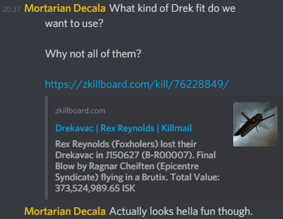 […] find a target, hit hard, then leave or burn away before hard tackle comes to hold them down. My own Drekavac fit is a great example of this. The long range disintegrator ammo is another bonus, giving them the […]