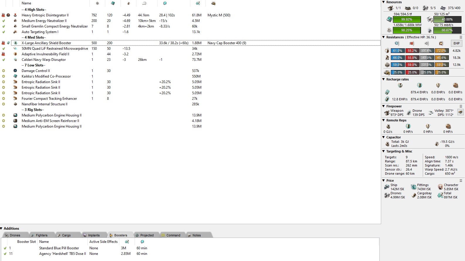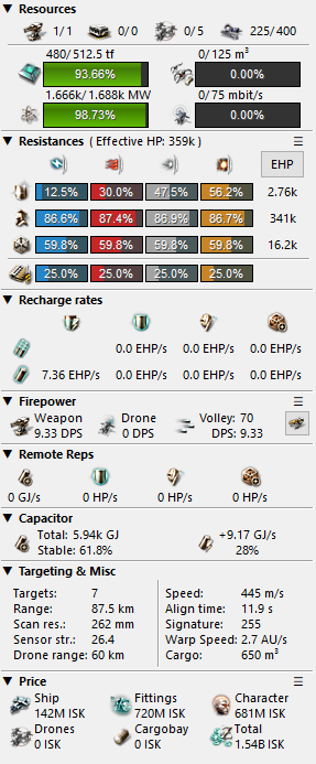 Baaaack to the base ship anyway. Applying just a T2 Damage Control to the ship increases total EHP by 10k up to 40k which is nice (and horribly OP already), but what really interests me is the shield. It increases by only three hundred and fucking fifty. 350 more HP is barely enough to tank a set of light drones for three seconds. Trying to expand this into a full shield tank with only four mid slots is a bad idea. It’s actually worse than the shield Vengeance I made a while ago, and that’s saying something.