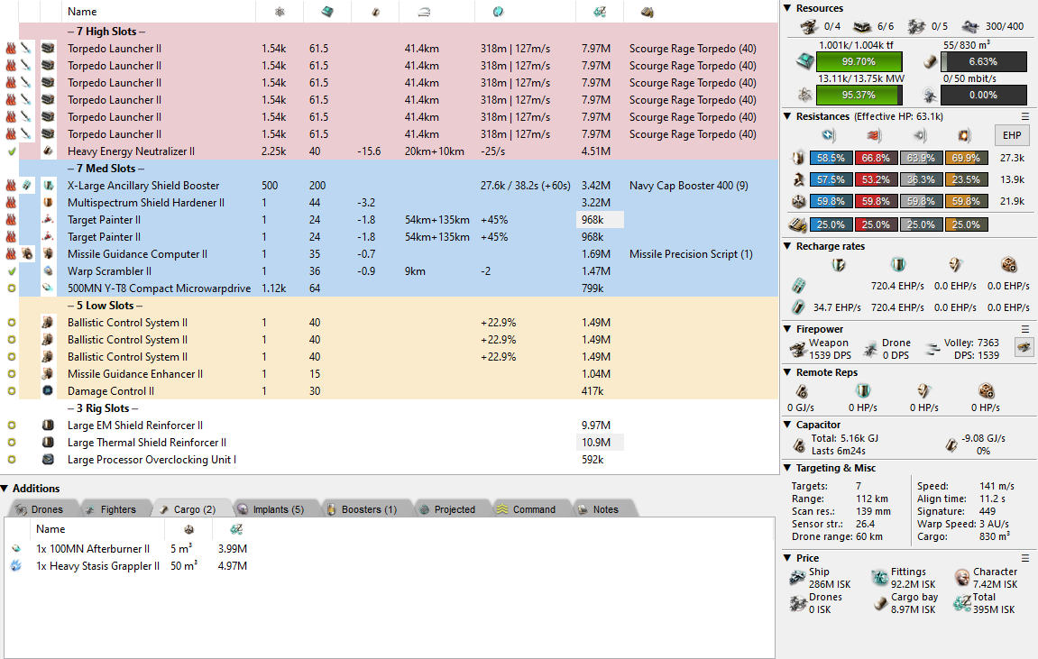 So how would I fit a shield torpedo boat? Well, the best choice is the Barghest due to that insane damage and range; a Rattlesnake also tops the charts with insane DPS but that just feels like cheating by using money and faction EHP to your advantage. A Scorp Navy Issue is fit in the exact same way. This leaves us with few cheap options. The Minmatar ships aren’t any good since 5 mid slots just won’t work for application and you’ll drop your shield tank below 70k EHP (though there is an armour fit in another article).