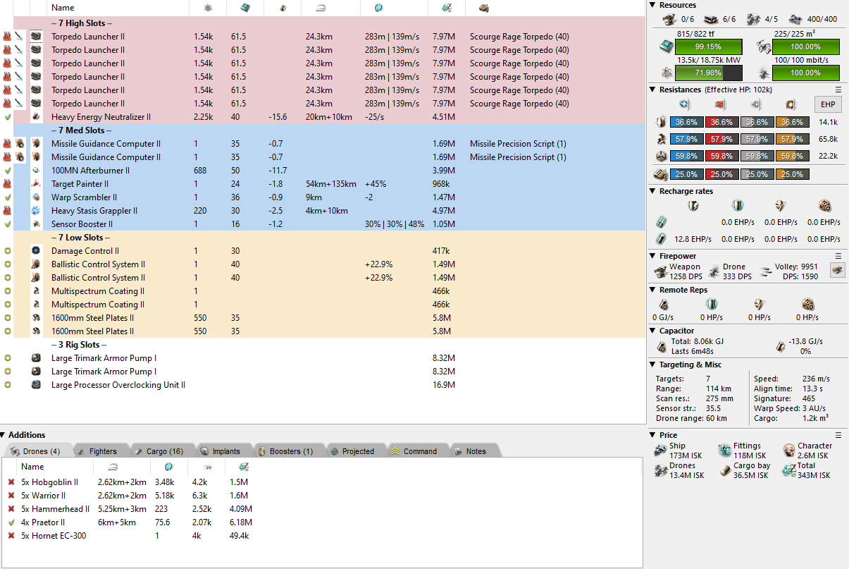 Onto the fits anyway and I want to start by showing off an ESS version of the best torpedo battleship I’ve used so far. Unsurprisingly, it’s the Praxis. With torps it can get about a 102k EHP tank, all the application mods in the world, and a delightful 10,000 damage volley. This is roughly equivalent to other top choices such as the Raven Navy Issue at a third of the price fully fit. If you’ve been a long time reader then you know I’m a big fan of ISK efficiency. The blob will always arrive eventually and your blingy ship will die just the same as my Praxis.