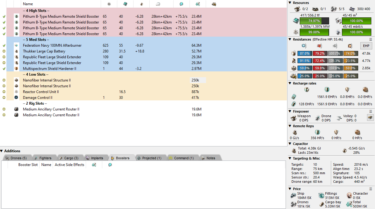 As for the Nightmare, it isn’t part of the doctrine but I can design one as if it were. Strangely, I’d still go for an active tank though. A buffer Nightmare doesn’t gain a huge amount of EHP, it only has about 130k and you still need a cap booster anyway! In a small gang scenario I’d probably use the fit below. Feel free to upgrade the Multispectrum and shield booster as much as your money allows but this seems fine for now. The key is to not get into a situation where you need that tank.