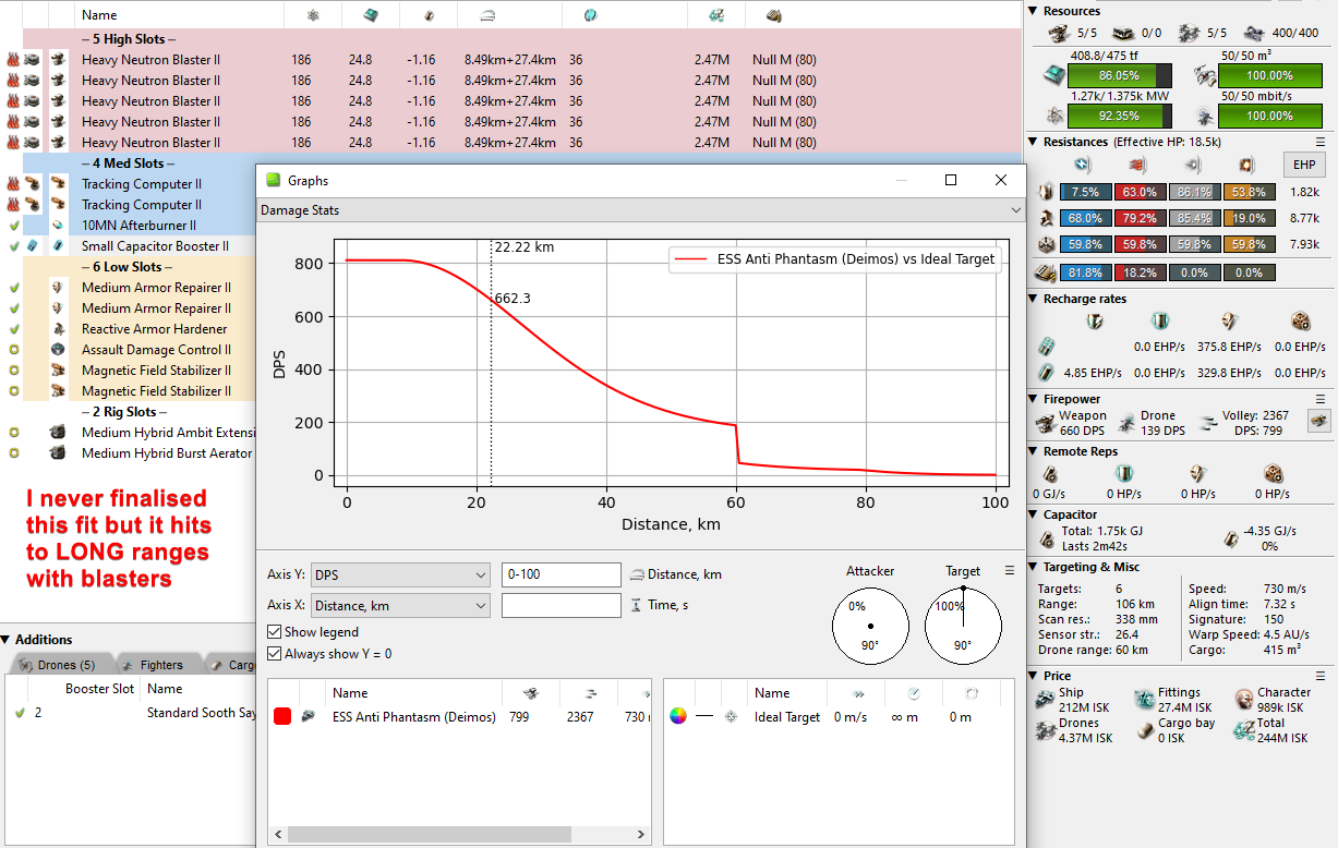 You could use a twist on the Huginn to try and catch hostile Phantasms if you like. It’s also quite possible to use an Ashimmu but I struggle to recommend such fits here. Reason being that it’s obvious. Any long web in an ESS is super valuable and doesn’t need a fit to be built around it. Simply warping in changes the game entirely into catching the Phantasm before he reaches the edge of the bubble. Likewise, anything designed to do extreme damage to such a Phantasm and tank it such as the Gila or a falloff-boosted Deimos… well the Phantasm will just burn away and leave.