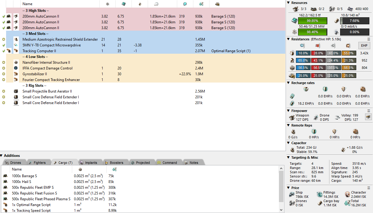As before, I’m providing two fits below which make use of their powergrid in very different ways. The one on the left is an autocannon plated fit with plenty of EHP to absorb some hits. Decent if you know that you can get on top of your target, but also the kind of fit which just dies if anyone tried to kite it. Your choice of ammo should be Barrage most of the time, but feel free to select EMP for a 25% drop in damage (at that range) in order to hit an EM resist hole. Another alternative is to swap the web (or scram) for a Tracking Disruptor to indirectly improve your tank.