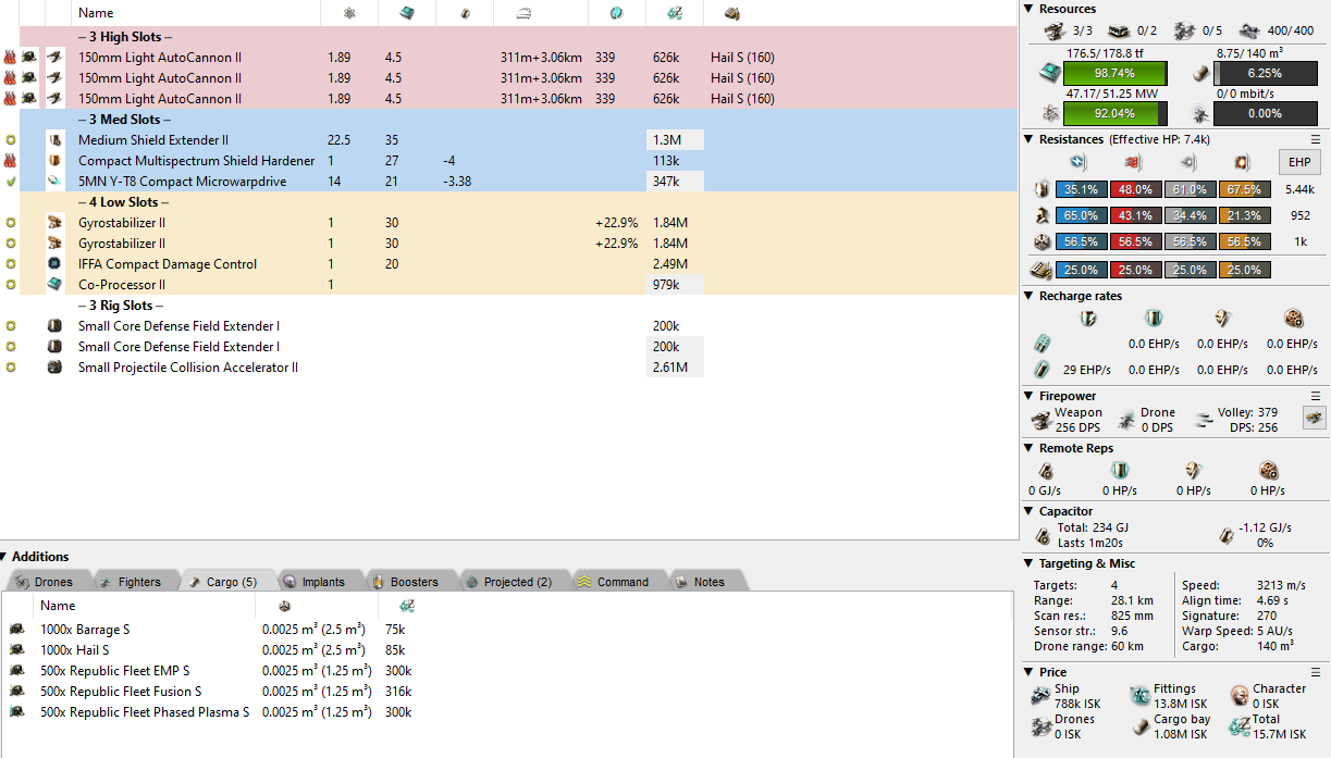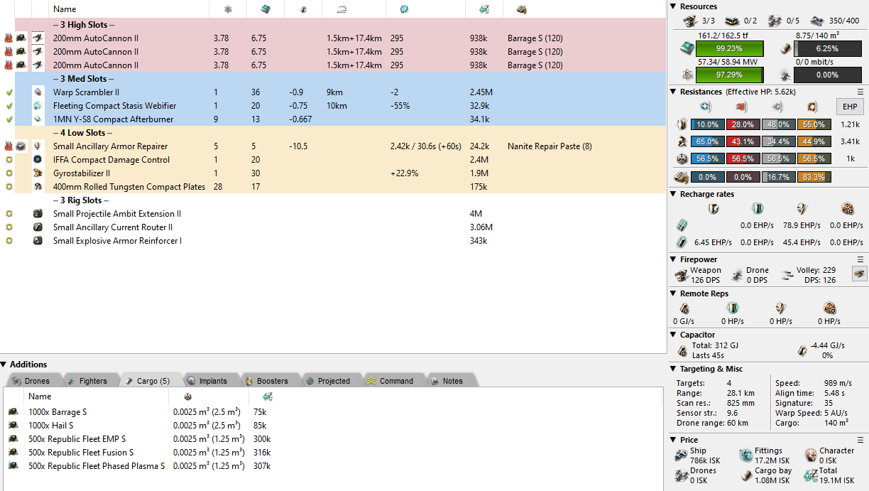 The same thing can be done in armour, too! A simple 400mm plate, scram/web, and we have something similar to my Academy fit which doesn’t need to be adjusted for newbros. This style of flying a Rifter is generally just kind of “ok”. You’ve got all-around average stats and in order to secure a win, you need to claw back an advantage through piloting skills. By that I mean proper ammo choice, recognition of what your opponent is trying to do, and not just throwing yourself at someone face first. You can fit an ancillary armour rep by making a lot of adjustments, but at that point it starts to become the scram kiter I mentioned earlier.
