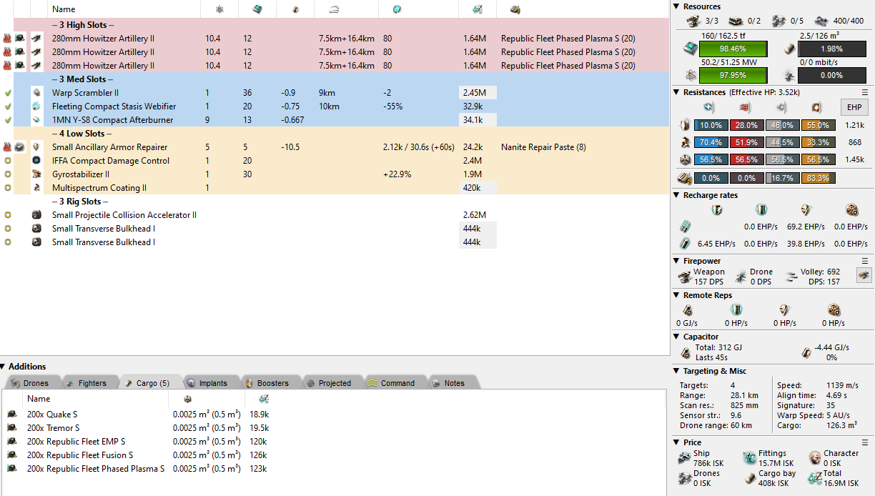 The Rifter on the right is an artillery variant. It has better DPS at 9km and some nice alpha with the tradeoff being that you lose about 2k EHP compared to the plated autocannon style. If you can survive long enough on grid then this particular boat has the nice bonus of being able to shoot back at kiting ships instead of keeling over and accepting the loss. Fun fact about the Rifter and the alpha damage it can do (which isn’t particularly special): A 692 damage volley aimed at another unplated Rifter will eat through about 80% of its armour in one shot!