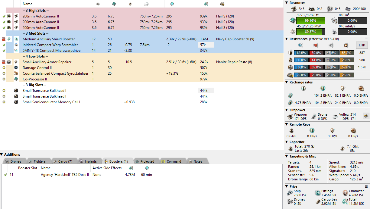 Finally, we arrive at the best kind of tanking there is – dual tanking! Fitting a Medium Ancillary Shield Booster and Small Ancillary Armour Repairer gives you a decent shield and armour tank without the downsides of either. For reference, the reason you normally never do this is because shield increases signature size, and armour decreases speed. Combining both of those really sucks and it is not synergistic with the effective use of slots normally, nor does it work under logi. This particular fit works similarly to a Breacher and makes for a relatively well-balanced fit. Total EHP if you use all charges is about 8.33k assuming that you use a Hardshell II. One last reminder for new players – use the smallest Navy cap charges you can in your shield booster, they all rep the same and you can fit more of the small ones (up to 9).