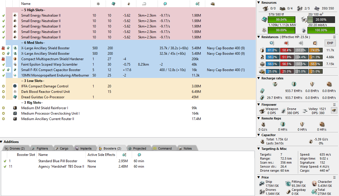 Moving on to the final fit that I’m actually kind of happy with, I like the idea of a dual XLASB full neut Gila. It only gets 380 DPS, but you don’t need much when you neut 45GJ/s. This roughly equivalent to 2x heavy neuts if you’ve ever been shocked by how effective they can be. Granted, the ship neuts itself out in about four minutes, but you should have the job done by then and you can always go 4x neut 1x nos if you really need to.