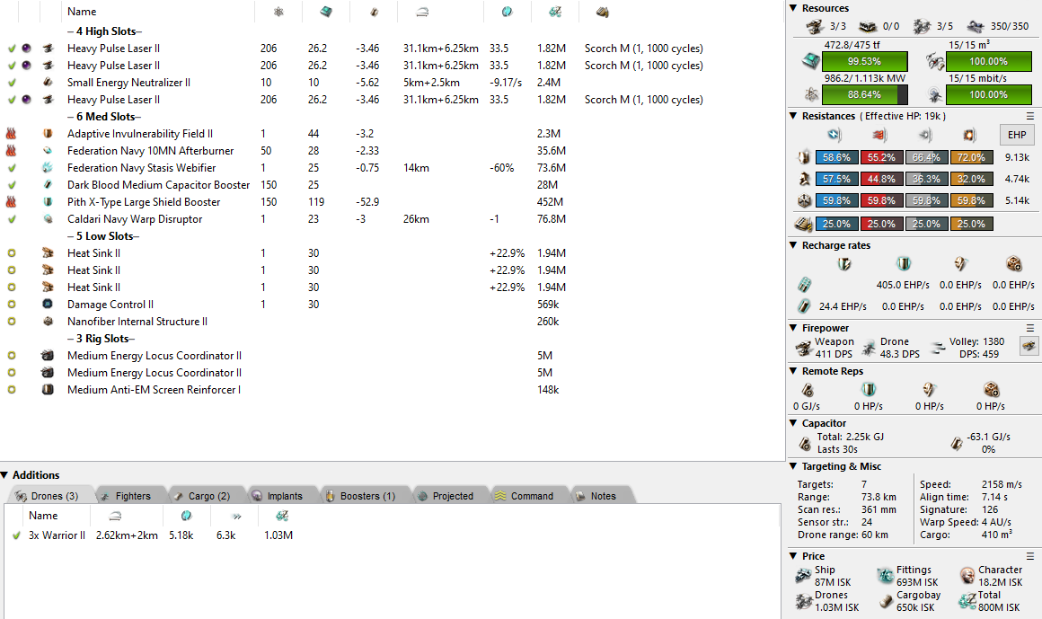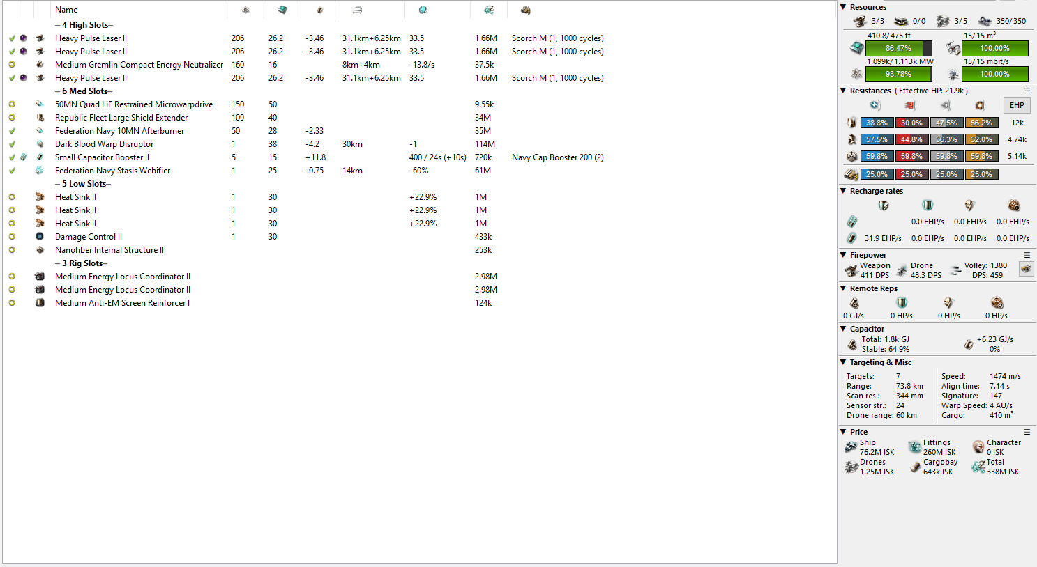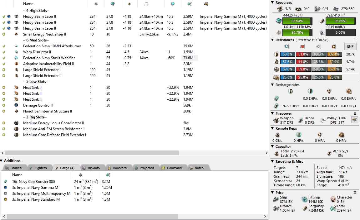 Additionally, if you feel like your ship needs a bit more ‘oomph’ with longer ranges. It’s very easy to swap out the pulses for beams with a bit of compacting in the lows. While you won’t track as easily (16.3 as opposed to 33.5), the bonus does help beam lasers immensely. It is still possible to hit small ships in heated web range with some careful flying. Damage wise, you’d see an increase of DPS from 521 heated to 646 with Imperial Navy Gamma loaded. Importantly, this beam fit also showcases an equivalent buffer shield tank. Signature radius struggles, but you can get an idea of what a 240m ISK Phantasm can do.