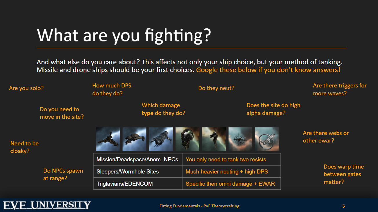 So moving on to the actual guide portion of this guide, we first have to consider what you’re fighting. The slide below goes over some of the main questions that you want to ask yourself as well as a list of some of the more popular hulls used in PvE content. The primary questions, though, are “which site/dungeon are you fighting in?” and “what type of enemies are you fighting?”