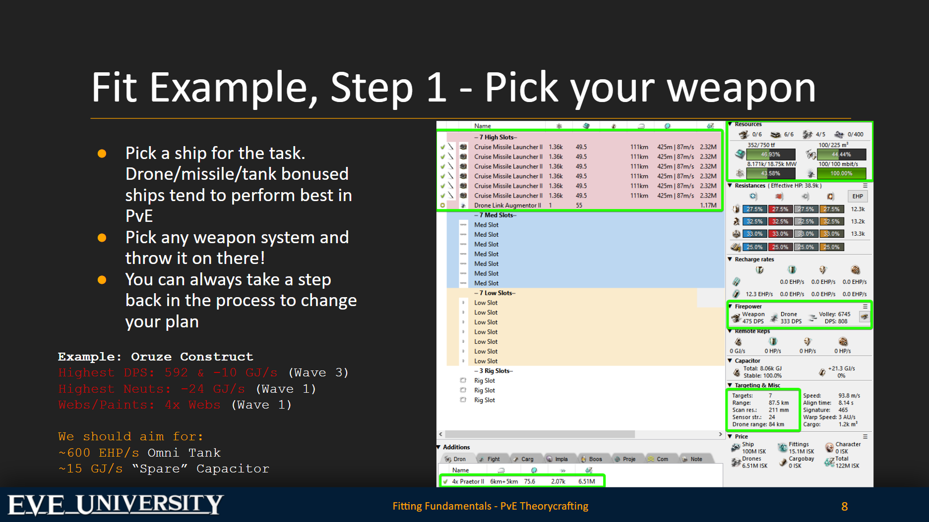 You’re going to want to start here by opening and taking a look at my EVE Uni slide to the right. The green boxes show what I’m particularly paying attention to during each step. What we’re designing here is a Cruise Missile Praxis that can kill the third wave of an Oruze Construct. It’s not as refined of a fit as in my How 2 Krab series, but it’s acceptable.