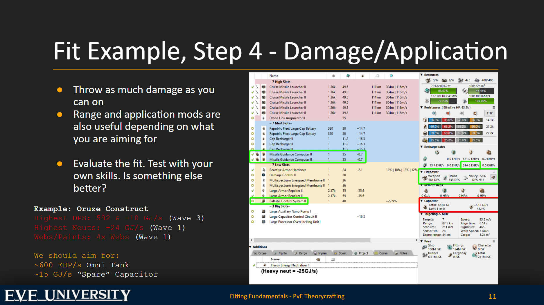 My slide on the left shows this being done with some missile guidance computers and a ballistic control. I can then examine my final fit to see the damage and application numbers. If I’m not happy right now then I could always go back to step one and begin again. I could also start modifying and playing around with any of the slots to try and achieve a more desirable outcome such as more outgoing damage!