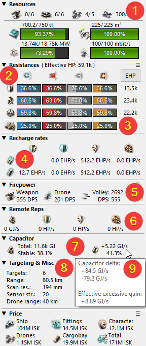 - Tank. This shows you how much you can repair per second with resists and damage profile considered. The top number is the maximum and the bottom is the best you can get under current simulated capacitor. If stable, these numbers are the same. From left to right: Passive shield regen, active shield reps, active armour reps, hull reps. “Projected” remote reps onto you will appear here, too.
