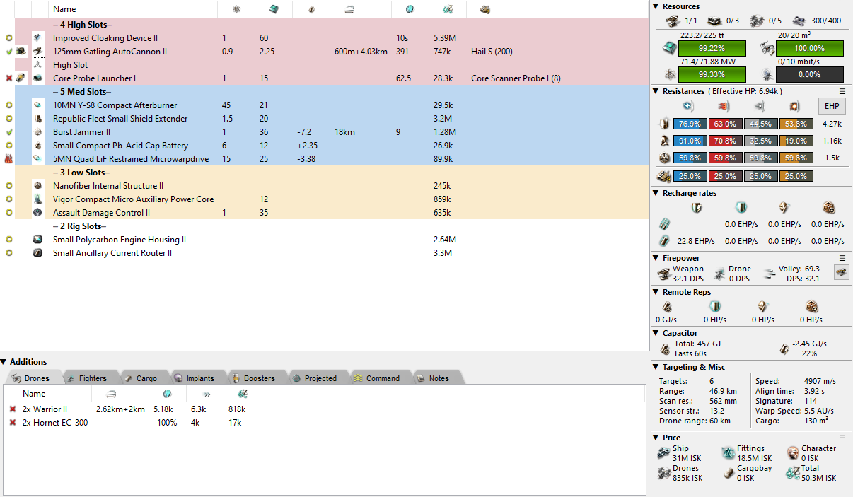 All of this said, my next fit is a dual prop Jaguar. It’s simple enough to pick up any old ramjag and use that instead, feel free to, but this one is designed with a specific purpose in mind. Your entire escape plan is to use the ADC and 5MN to get as far as possible while tanking up to about 23k EHP (Small shield extenders, eh ;)). The 10MN AB is there as a backup for if you get scrammed just kilometres from freedom. It’s my least favourite of the four fits, but it’s a tankier option at least.