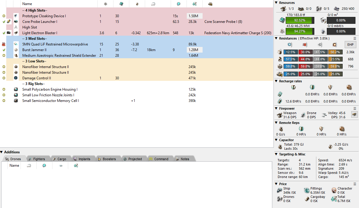 So there are quite a few ways of doing all of the above. I’ll try and provide three different price point options below. The first of those is the humble T1 Atron, making good use of that high base capacitor and a semiconductor rig. You see, something I didn’t realise on my first fitting pass was that the ECM Burst II chews up 288GJ capacitor to activate as a base value! This means that you’ll need to have about 60% of your cap in reserve in order to pulse it with decent skills. Worth having, though. Throwing off that lock to burn out of range is the difference between you and a dead pod.
