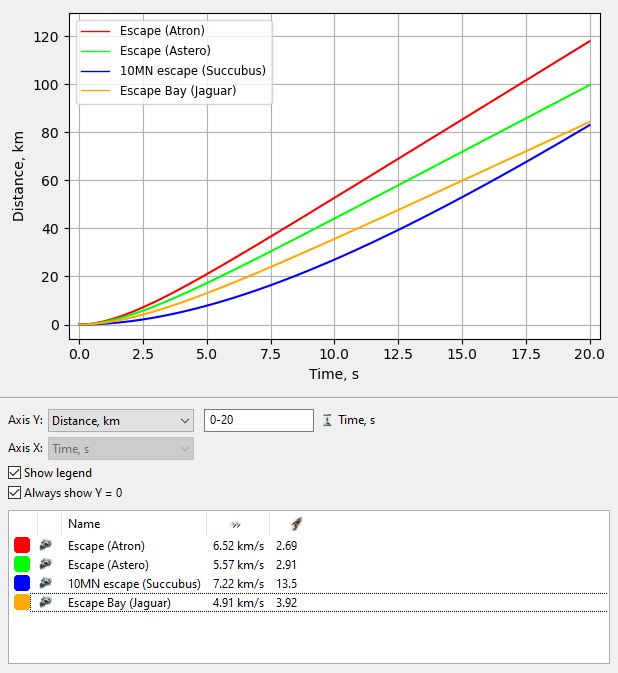 Past that first burst of speed where the 5MN wins, you can start to consider other options. 50MN, for example, only picks up at about the 17 second mark where you have already travelled 105km. 10MN works decently well with only a minor falloff compared to 1MN. If you’re going to use one of those, then I recommend using a Succubus to really get the most out of the top end of that speed.