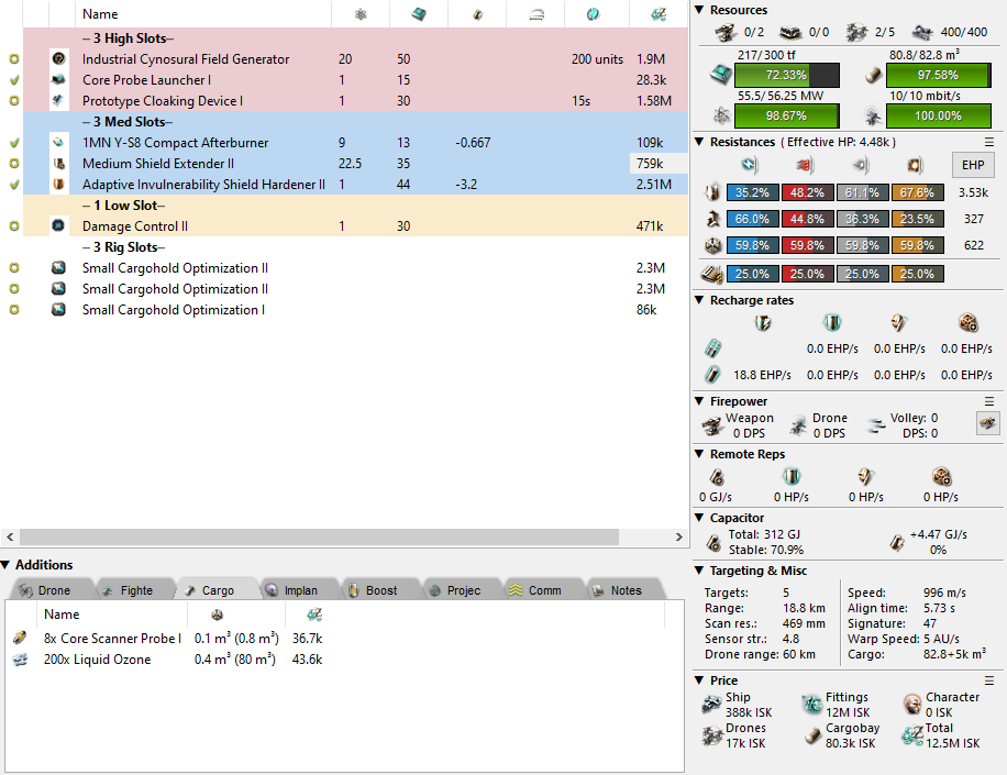 Finally, I’m including a standard cyno Venture fit. Some people don’t realise just how much it needs to be cargo rigged before the Ozone fits inside. There isn’t much wiggle room with regards to what you fit on this. I’ve gone with 1MN, assuming that people will want to pick their positions on stations more quickly. A power core + second shield extender will give you more tank instead, or you could drop the cloak and take a scram if you’re actually trying to bait and trap someone. Whichever way you do it, you need 80m³ of space to place the required 200 Liquid Ozone inside at Cyno 5. This can also be done at Cyno 4 with an Expanded Cargohold low slot.