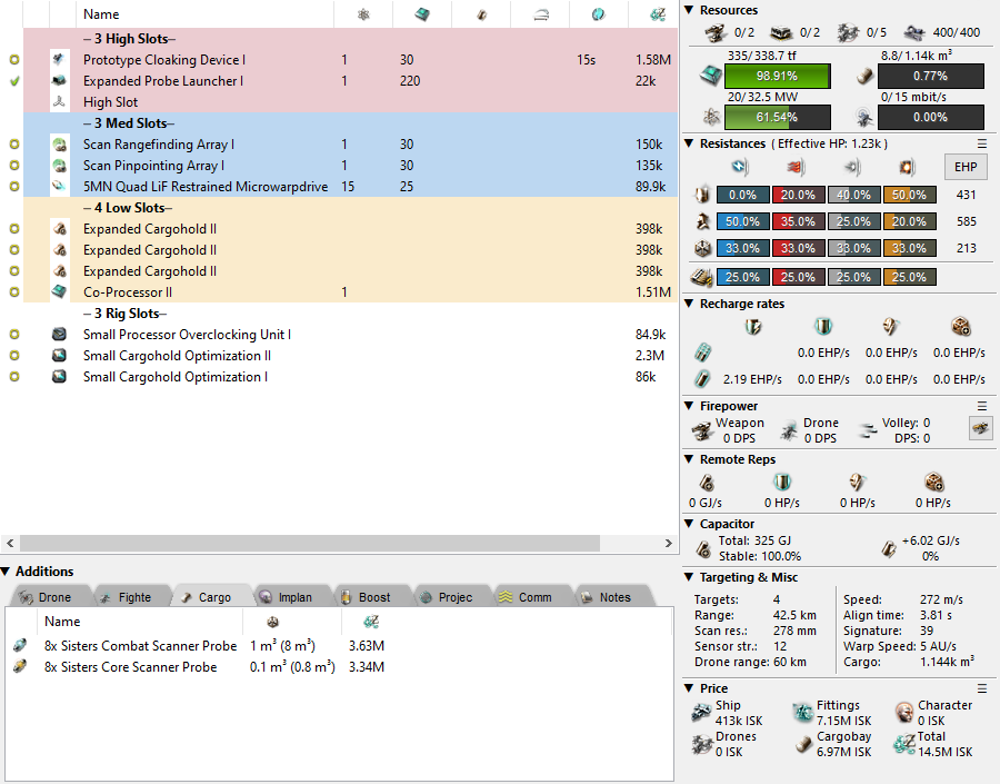 There’s also the cargobay Magnate which takes things to the extreme. It’s quite possible to reach 1.75k m³, but if you’re going to use this ship then you might as well get the scanning potential out of it too. An expanded launcher opens up options for combat scanning other ships as well as wormholing your way out of incoming danger deep in null.