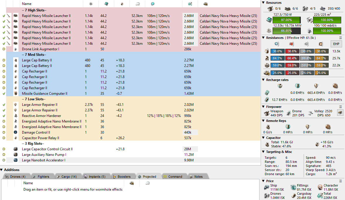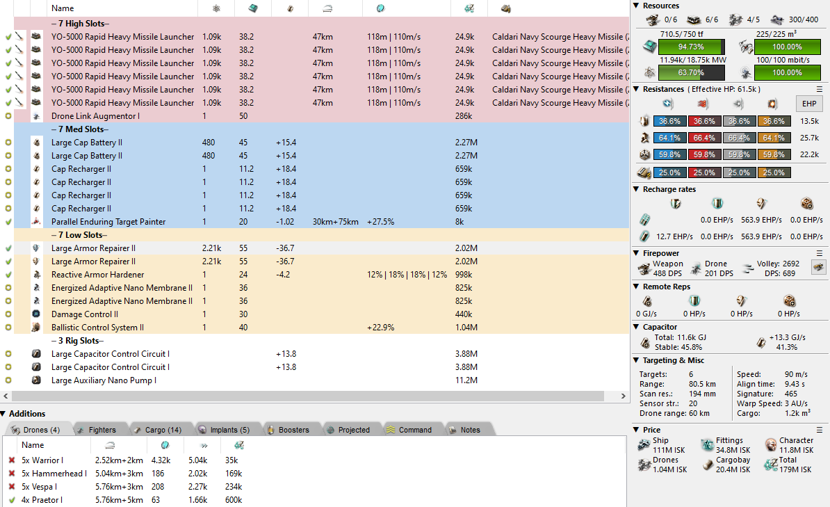 Praxis: I’m still skeptical of your fondness for the armor version. Not only does it require the lengthy Hull Upgrades V to work (without spending extra ISK on green EANMs to make up for lost tank), it also does a good 100 DPS less than even a conservative fit shield version with t1 launchers and decent cap stability %, just on the virtue of not having low slot room. Not having a damage mod on a battleship is simply a huge loss in performance by default. Same criticism applies to the C2 praxis.
