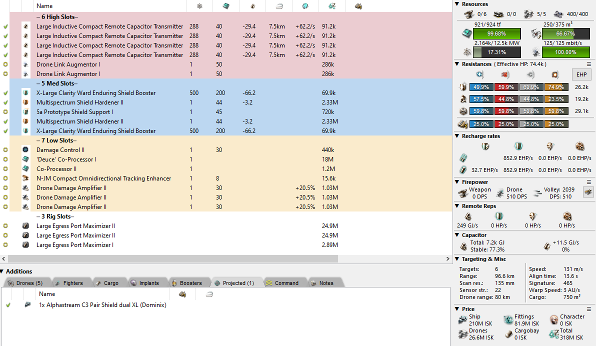 The other thing I can suggest for running C3 sites is an unorthodox version of a Dominx pair. This will need a second pilot, but you can scale it up and keep bringing more to add onto the chain as necessary. It’s a tinker shield tank fitted in a particular way to get around Alpha Clone drone limitations. By squeezing two Drone Link Augmentors on, you get the range up to a respectable 80km for one. A shield fit also means 3x Drone Damage Amplifiers compared to zero or one that you would have on an alpha armour fit. I tried it, and running a battleship with 250 DPS just isn’t cool. To fly these, you should warp in together and send cap to each other while running your local shield boosters. Be sure to stay within range.