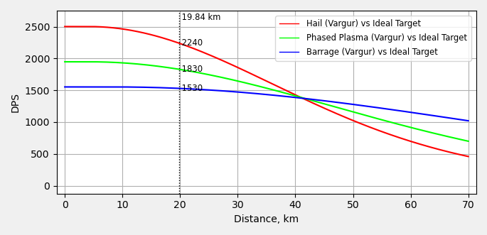 The Vargur is probably my favourite Marauder for running C5 wormhole sites and that isn’t just because I’m a Minmatar fangirl. It’s just a really nice mix of damage, tracking, and range with a relatively low price. The problem it runs into is that while Barrage is decent, it is a bit slower than the Paladin at killing long-range Sleeper Battleships. I’ve included an image below which describes the best ammo to use at each range (1x optimal TC + 3x Gyro, no implants).