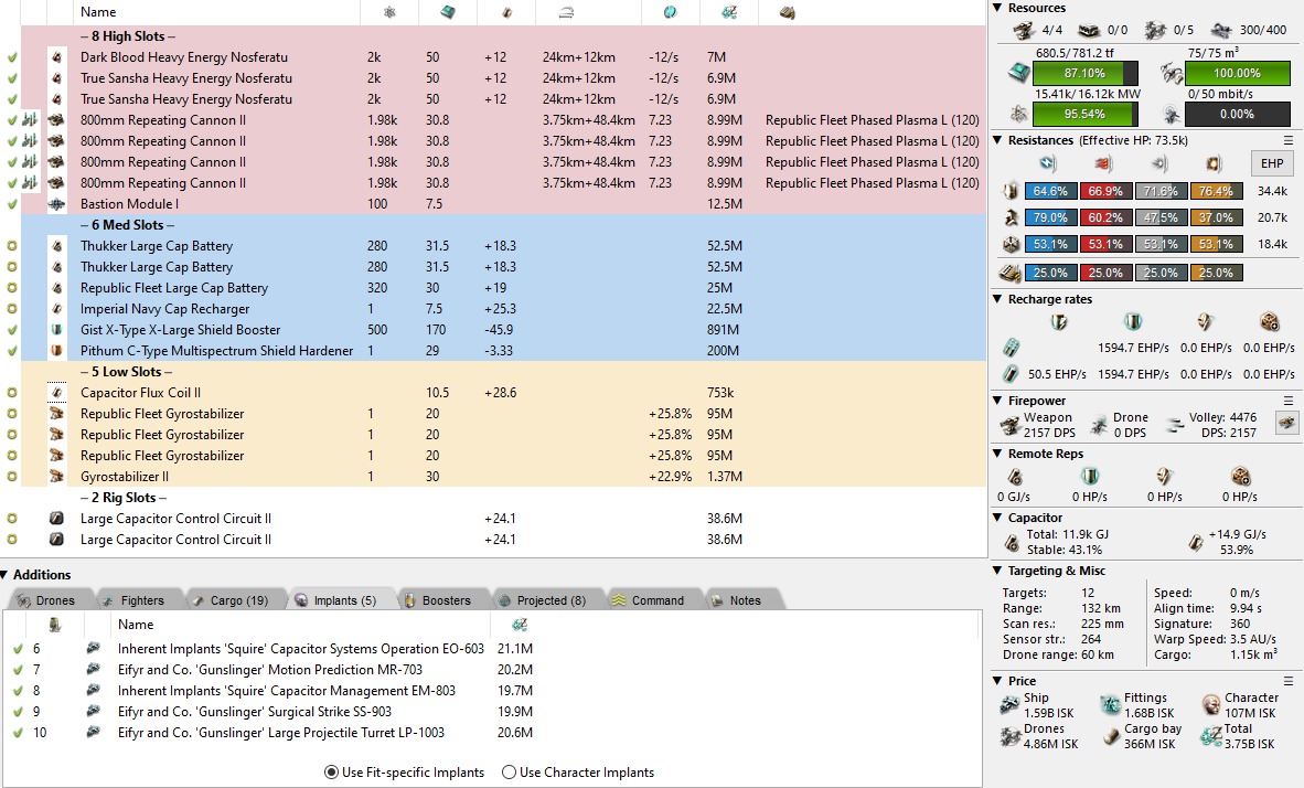 As with all of my fits, please plug these into Pyfa with your own skills to be sure of cap stability. I’ve designed them with Marauders 4 in mind, but your other skills need to be pretty good. Carry Blue Pill, Exile, and Mindflood just in case because once you’re in site, you’re in site. I’ll try to explain everything you need to know in the text above each fit so be sure to read it. And some advice: Hardshell 2/3 and a slot 6 Repair implant can make you good enough to make a Marauders 5 fit work at Marauders 4. You might also want to refer to my Frigate Escape Bay guide to protect your pod. Update: Ensure that you stagger your Nosferatu on the Drifter so that you don’t get neuted down past 25%