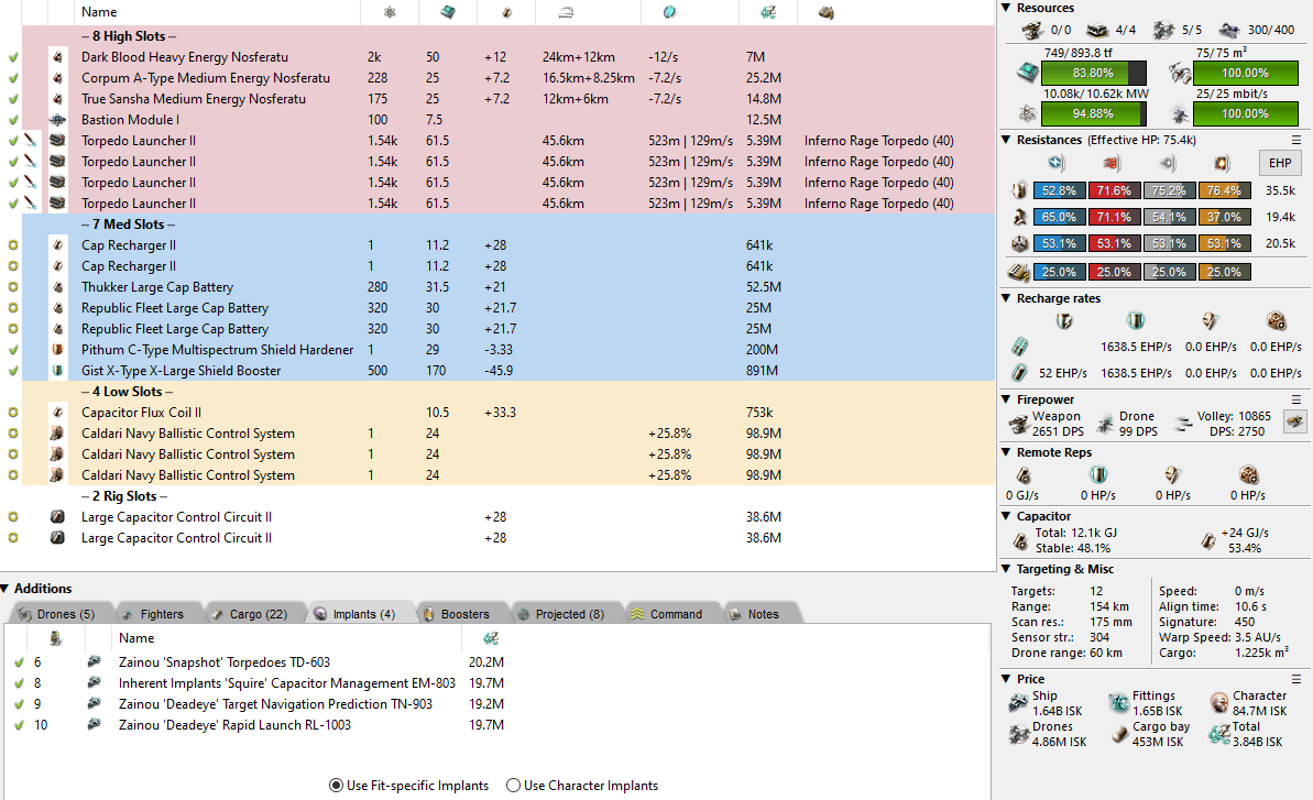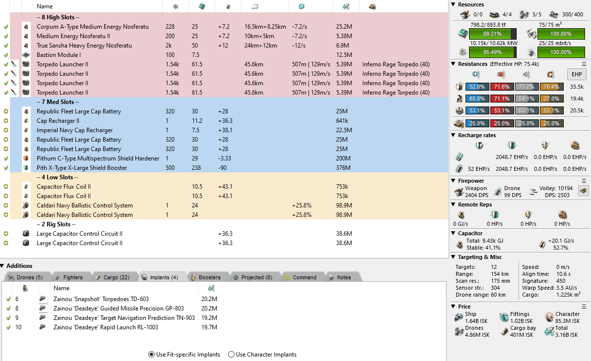 For killing the Drifter with this fit you will be swapping to an extra battery and 2x more Nosferatu. You might also consider swapping Flux Coils -> Dark Blood Cap Power Relays if you capacitor skills are bad. Just be sure to move away from any wrecks/structures and anchor the bubble then trigger the Drifter. Be sure to shoot thermal into his shield and EM into his armour using faction ammo, not Hail. The drugs in the fit are not needed at all times, but keep them on hand just in case.