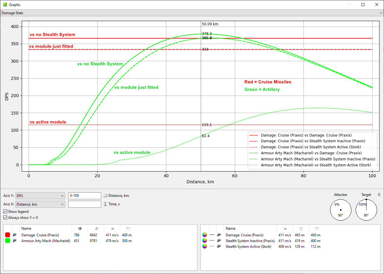 Let’s take an example, though, and what better example to use than my own Praxis fit. It has a base signature of 465m which is reduced to 419m with the “Stealth System” inactive. Activating it will reduce the sig further right down to a tiny 127m! I’ve gone ahead and put an X-Type heated AB on there to simulate any other afterburner battleship. Now we can simulate it with three conditions: No Stealth System, Module fitted but inactive, and module active. I’ve used a cruise Praxis and arty Machariel as the aggressors here.